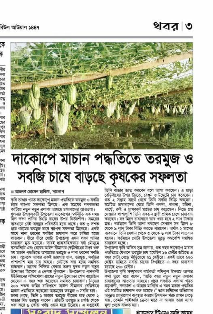 কৃষি ভাণ্ডার খ্যাত দাকোপে মাচান পদ্ধতিতে তরমুজ ও সবজি চাষে ব্যাপক সফলতা মিলছে। এক সময়ের লবণাক্ততা কাটিয়ে নতুন নতুন এলাকা আসছে চাষাবাদের আওতায়।